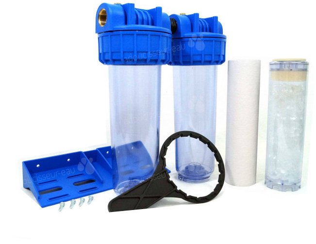 Filtre avec 2 cartouches, 1 cartouche à particules + cartouche anti calcaire + clé + support